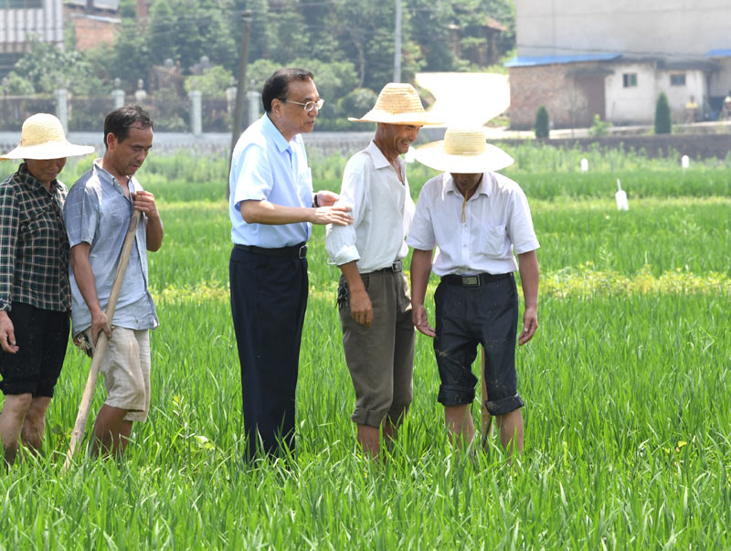 李克强总理6月11日来到湖南衡阳衡南县云集镇白水村考察农业生产情况。沿着狭窄泥泞的田埂,总理走进一处稻田,察看秧苗长势,并与正在田间耕作的农民一笔一笔算细账。从田头返回时,一位农民为方便总理在狭窄的田埂走路,下到水田,总理一把拉他上来说:咱们排队一起走!(新华社记者 饶爱民 文并摄)
