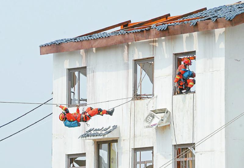 救援队伍携带生命探测仪器和搜救犬快速进入“灾区”实施救援。 (记者 郝飞 摄)